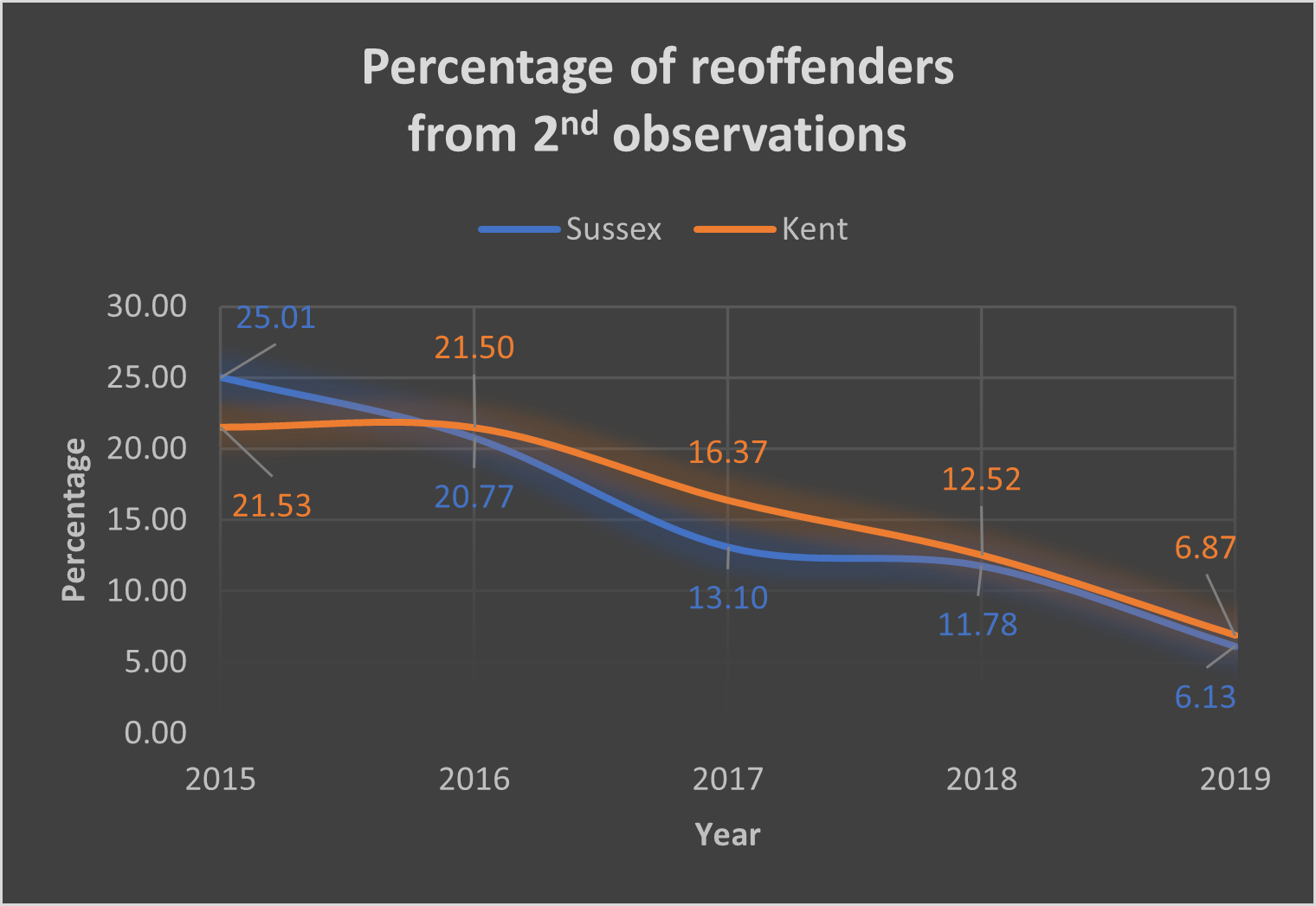 different times, and places), we might be able to demonstrate a significant reduction of repeat offence observations over time,
